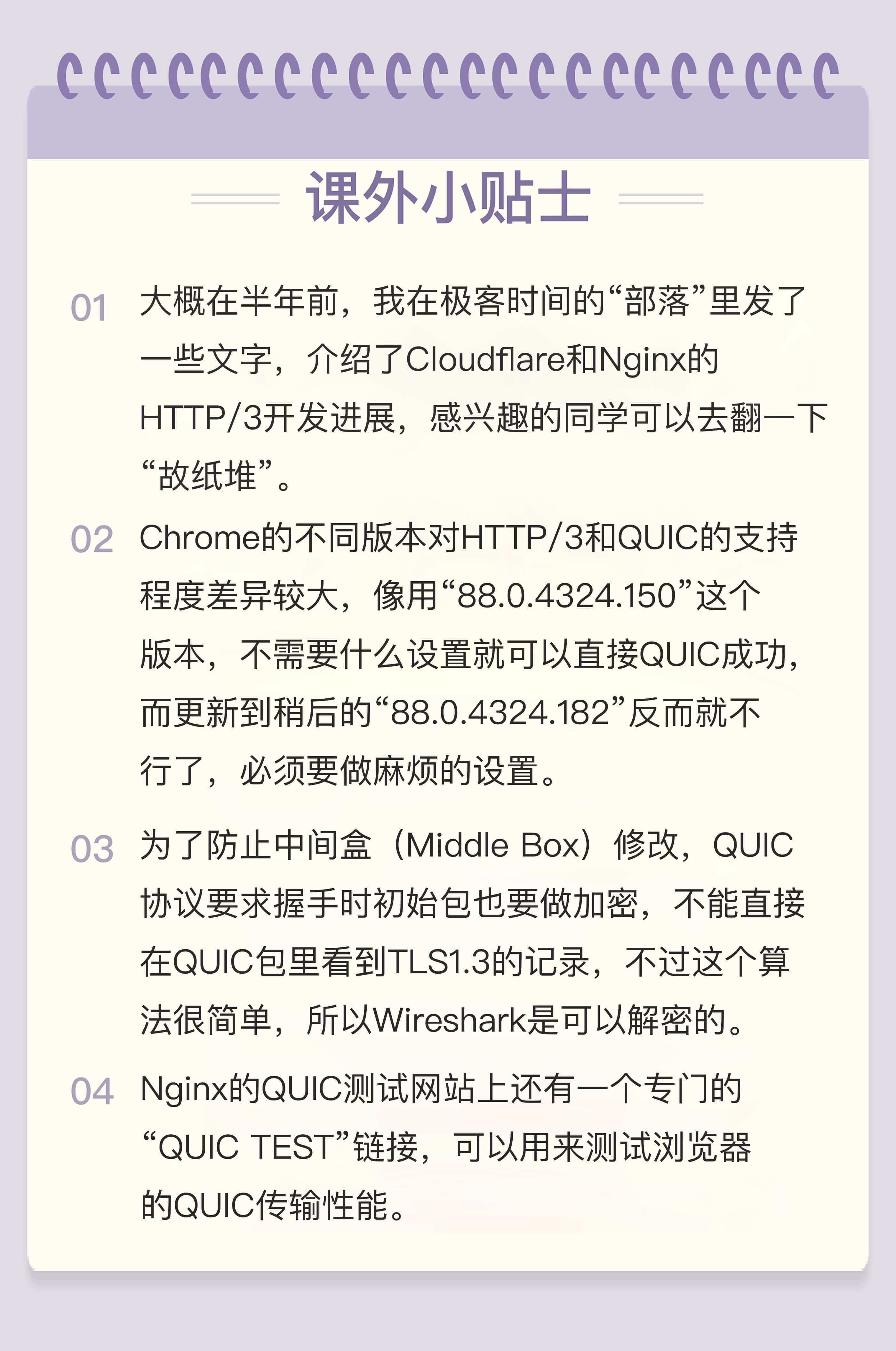 希望你看完这一讲后自己实际动手操作一下,访问网站再抓包,如果能正确解密HTTP/3数据,就把资料发出来,和我们分享下。