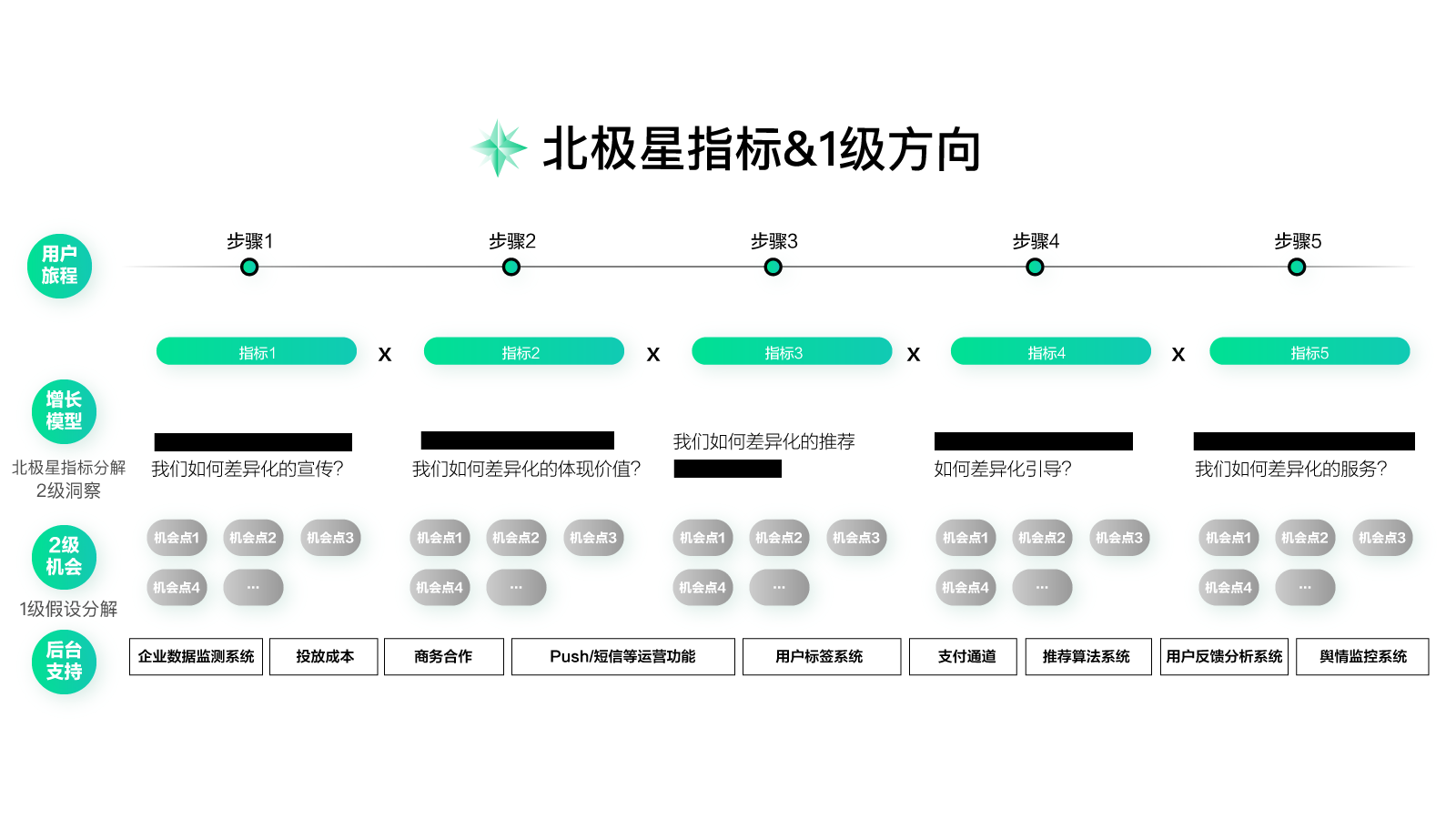 我们具体要做什么事情,才能围绕一级方向提升北极星指标。之前我们结合北极星指标和差异性的用户洞察,得到了一级方向。这里需要结合二级增长指标和二级洞察,得到对应的二级机会。