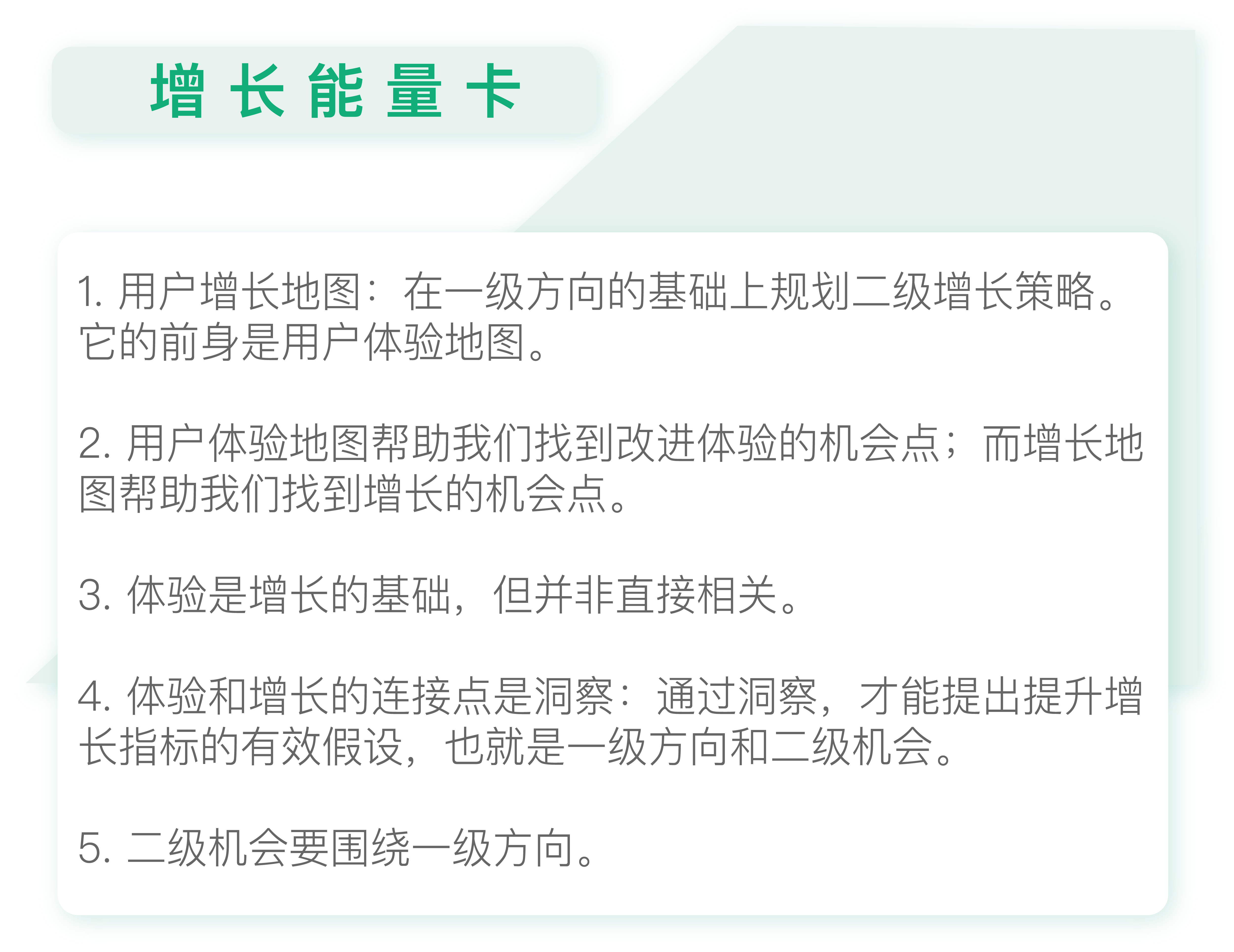 用户增长地图同样从用户视角出发,记录他们与产品或服务接触的关键过程。我们一直强调“以用户为中心增长”,所以这点是至关重要的。此外,**用户增长地图以增长为导向,帮助我们在全局中找到“四两拨千斤”的关键环节并提出相应的增长策略。**那么它是怎么做到的呢?来看看增长地图的内容吧。