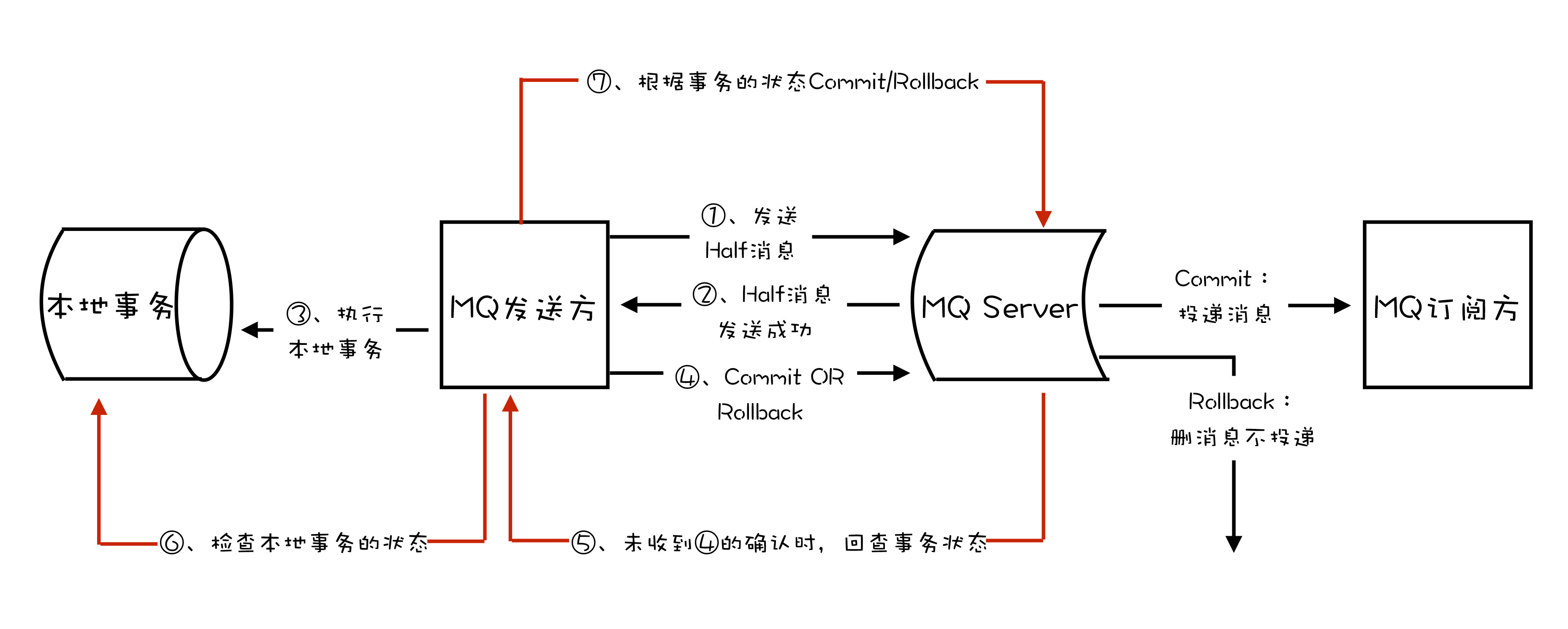 综合上面讲的通用事务消息的实现和RocketMQ的事务反查机制,使用RocketMQ事务消息功能实现分布式事务的流程如下图: