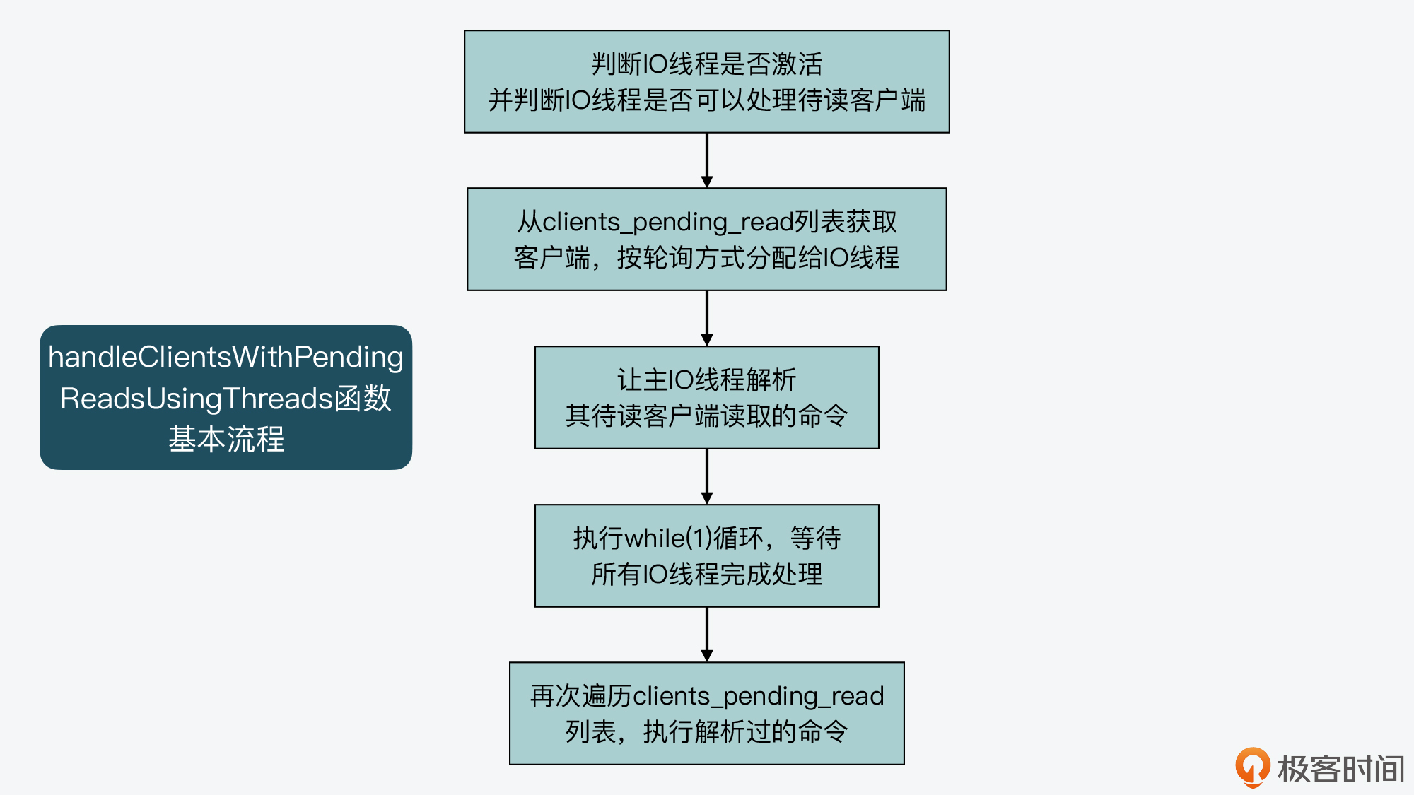 好了,到这里,你就了解了clients_pending_read列表中的待读客户端,是如何经过以上四个步骤来分配给IO线程进行处理的。下图展示了这个主要过程,你可以再回顾下。