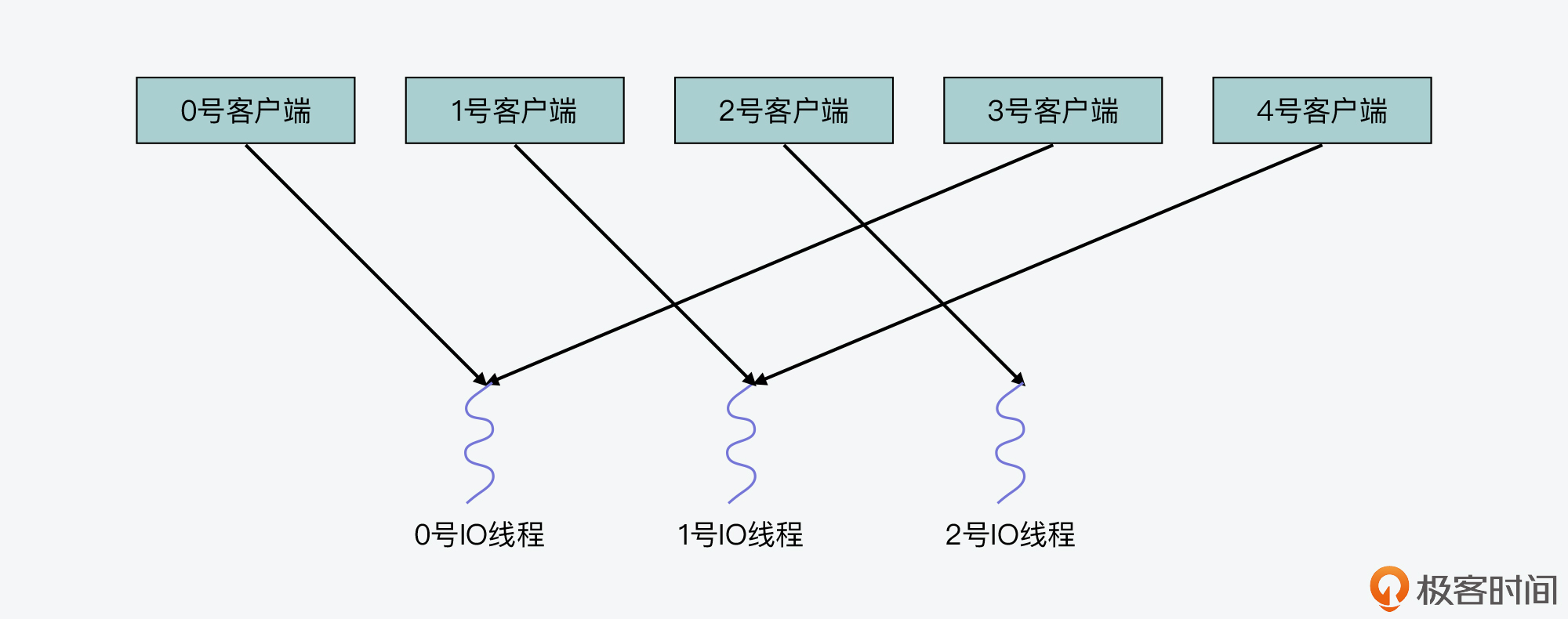 假设IO线程数量设置为3,clients_pending_read列表中一共有5个待读客户端,它们在列表中的序号分别是0,1,2,3和4。在这一步中,0号到4号客户端对线程数量3取模的结果分别是0,1,2,0,1,这也对应了即将处理这些客户端的IO线程编号。这也就是说,0号客户端由0号线程处理,1号客户端有1号线程处理,以此类推。你可以看到,这个分配方式其实就是把待处理客户端,以轮询方式逐一分配给各个IO线程。